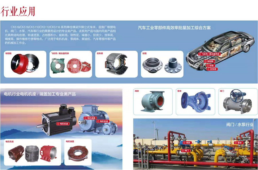 CK516/CK518/CK5110/CK5112/CK5116系列單柱橫梁升降立式車(chē)床,是我廠根據(jù)電機(jī)、閥門(mén)、水泵、汽車(chē)等行業(yè)的需要而設(shè)計(jì)的專(zhuān)業(yè)類(lèi)產(chǎn)品。該系列產(chǎn)品具有結(jié)構(gòu)合理,轉(zhuǎn)速適宜,占地面積小,能耗低,剛性足,噪音小,投資少,效率高,精度高,操作維修方便等特點(diǎn)。廣泛用于電機(jī)機(jī)座、泵閥體、柴油機(jī)、汽車(chē)零部件等產(chǎn)品的機(jī)械加工作業(yè)。